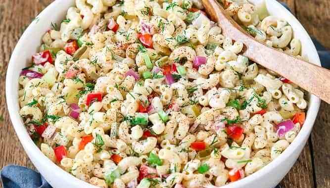 - In a large bowl combine yogurt, mustard, salt and pepper. Add pasta, diced vegetables and corn.